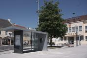 Die bewusst moderne Gestaltung mit großformatigem Pflaster, Sitzbank-Skulpturen und den transparenten Stahl-Glas-Konstruktionen der Buswartehäuser lässt einen zeitgemäßen städtischen Platz entstehen, welcher der gesamten Bevölkerung zur Verfügung steht und Raum bietet für verschiedenste Veranstaltungen und Szenarien.