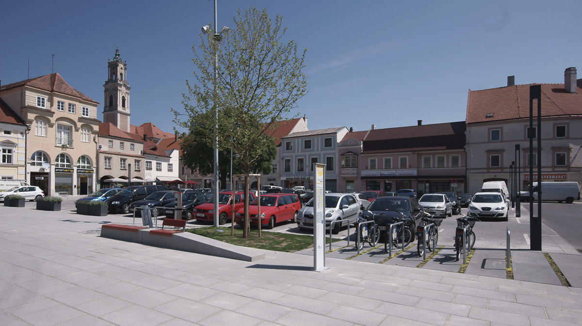 Durch die Konzentration der Parkplätze auf die östliche Platzzone und die Randbereiche konnte ein großer zentraler Bereich zwischen Rathaus und Kulturhaus frei gespielt werden, der für unterschiedlichste Nutzungen eine variable Plattform bietet. Durch die „freie Mitte“ wird ein diagonales Überschreiten des Platzes ermöglicht, womit die räumliche, grosszügige und offene Wirkung der Neugestaltung erst zur Geltung kommt. Der Passant wird in den Vordergrund gestellt und nicht mehr an die Platzränder verdrängt. Der Individualverkehr kann weiterhin stattfinden, wird jedoch den Fußgängern untergeordnet.